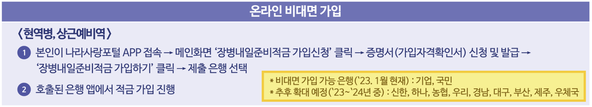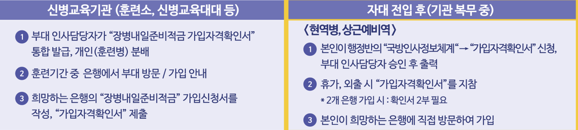 직접 가입하는 방법으로 훈련기간 중 은행에서 부대 방문해서 진행할 수 있습니다. 이 때 입출금 계좌가 있어야지 군 적금 가입가능합니다.(나라사랑카드 계좌로 가입)