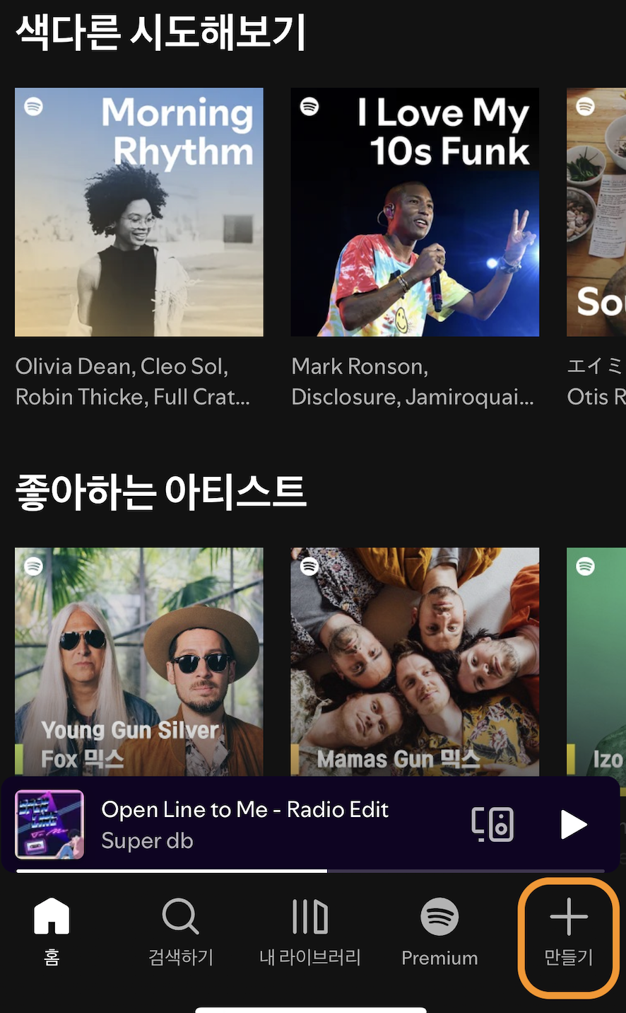 스포티파이(Spotify) 같은 경우 추천해준 음악 및 본인이 원하는 아티스트로 플레이리스트를 구성할 수 있으며 이를 친구와 같이 제작할 수 있습니다.