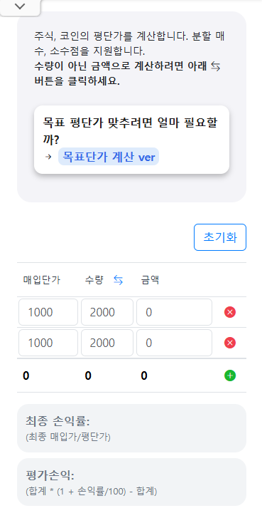 기본 Version은 '매입단가', '구매 수량' 또는 '금액'을 입력하여 최종적으로 평균단가를 얻을 수 있습니다.