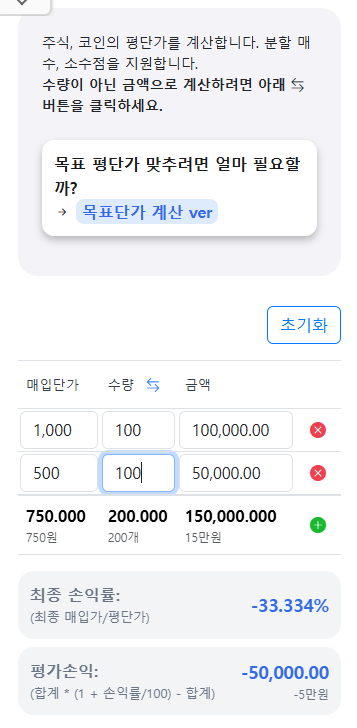 주식 코인 물타기 계산기, 평단 계산기 | 유틸즈 (utilslib.com)